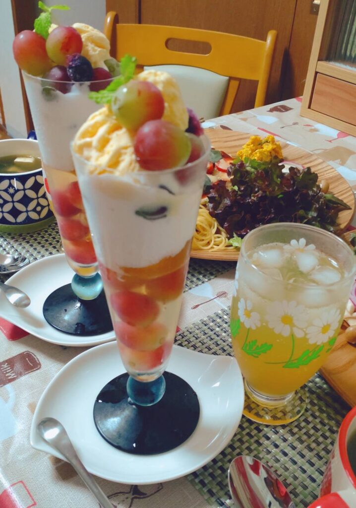 そして今回のもう一つの主役が、背の高いグラスに盛ったフルーツパフェ。 ぶどうをメインに、オレンジやバナナ、ベリー類を重ねて、間にヨーグルトやアイスを挟んでいきます。 下の層にはジュレを入れたので、光が当たると透けて見えて涼しげ。