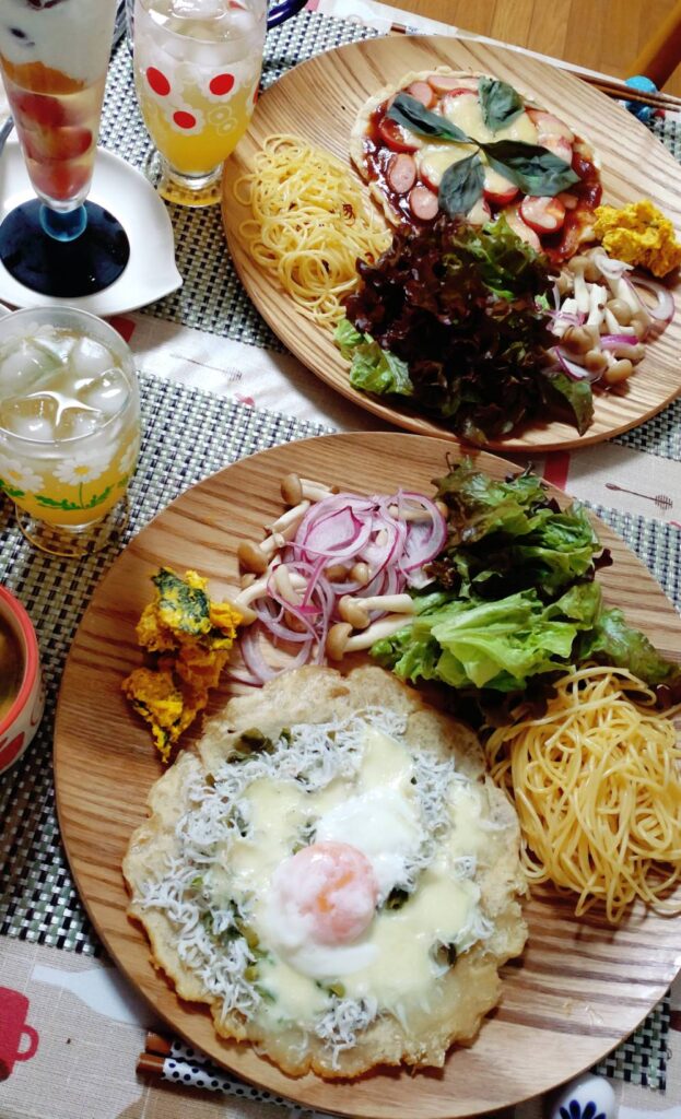 ただピザだけを置くと、どうしても「大きな丸」になりがちなので、周りにサラダや小さなおかずを並べてプレートにしました。 レタスやサニーレタスに、薄切りの紫玉ねぎ、きのこソテー、かぼちゃサラダ、そして素のままのスパゲッティ。 聞くだけだとなんだかバラバラですが、木のプレートにのってしまえば不思議と“カフェランチ”に見えてくれます。