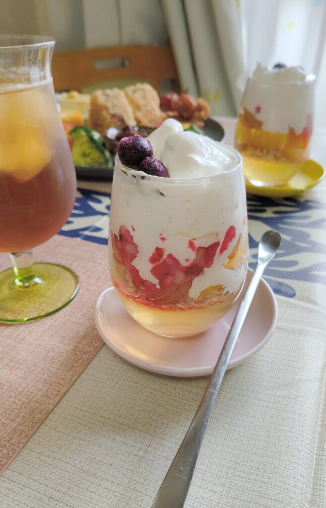 グラスの中に重なったフルーツ、クリーム、ゼリー。