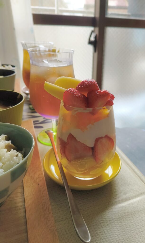 今回の定食で、ひときわ目を引くのが、食後のパフェです。透明なグラスに重なったフルーツとクリームは、やっぱり見ているだけで気分が上がります。