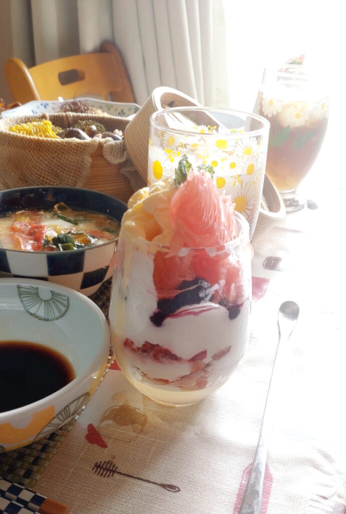 ドリンクも、見た目がかわいくて、気分を盛り上げてくれています。こういうグラスを使うだけで、日常が少し特別になります。高いものじゃなくても、「好きなものを使う」だけでいいんですよね。