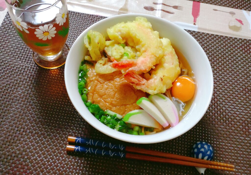 2枚目は2024年の大晦日。こうして並べて見ると、「あれ?ほぼ同じ?」という気もします。えび天、かまぼこ、油揚げ、ねぎ、生卵……主役メンバーは変わりません。
